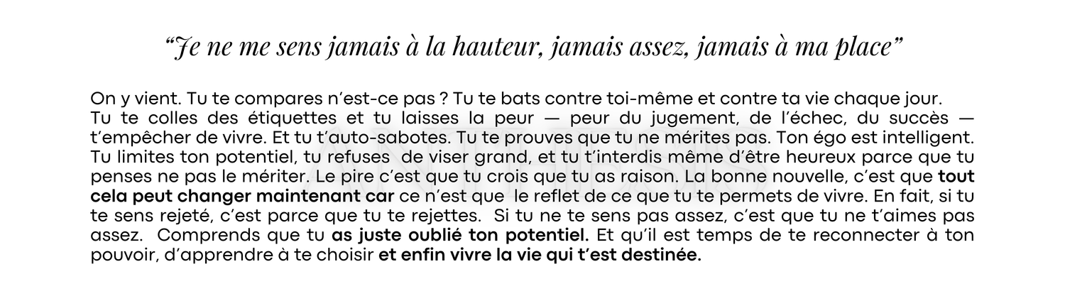 Tu t’y habitues. Tu l’appelles “la vie”, “la réalité”, “la maturité”. Mais ce n’est pas la vie. C’est l’absence d’amour envers toi‑même. Ne pas t’aimer te coûte TOUT.